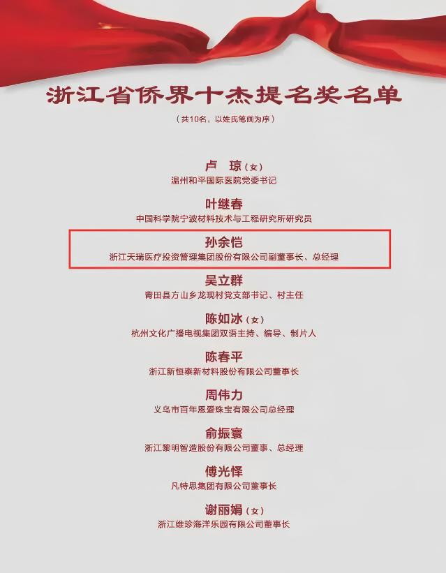 浙江天瑞医疗集团总经理、台州博爱医院党委书记孙余恺博士荣获浙江省侨界“十杰”提名奖!